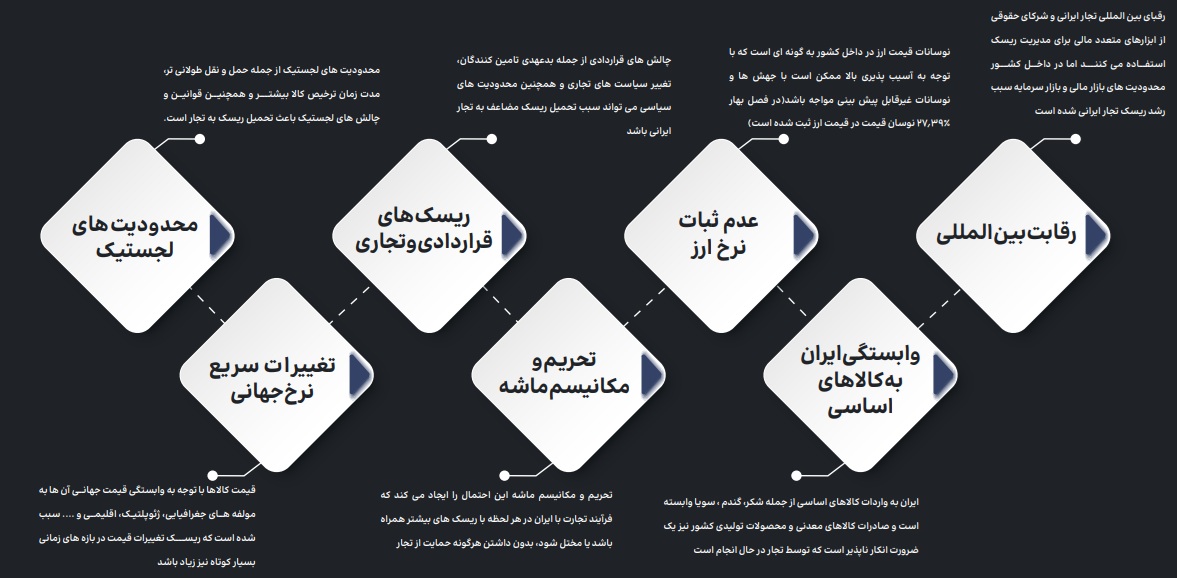 رقبای بین المللی تجار ایرانی و شرکای حقوقی از ابزارهای متعدد مالی برای مدیریت ریسک استفــــاده می کننــــــد اما در داخــــل کشـــــور محدودیت های بازار مالی و بازار سرمایه سبب رشد ریسک تجار ایرانی شده است.