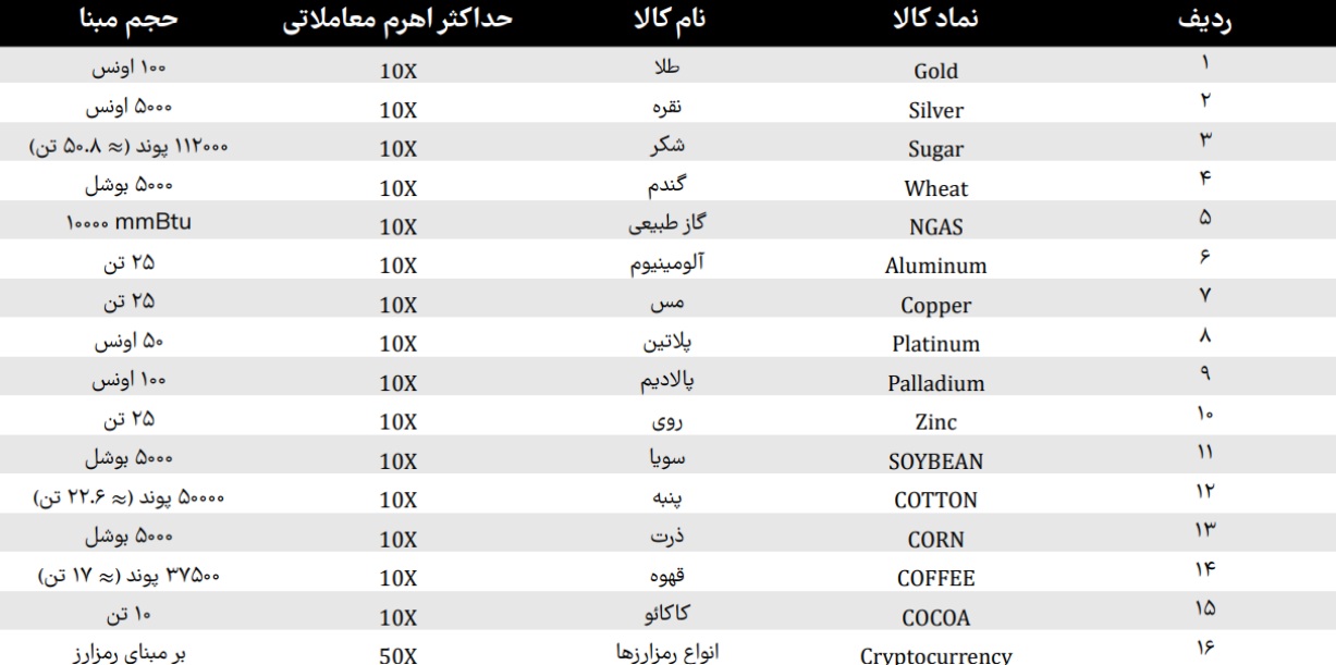 کالاها و نمادهای قابل انجام در طرح پوشش ریسک